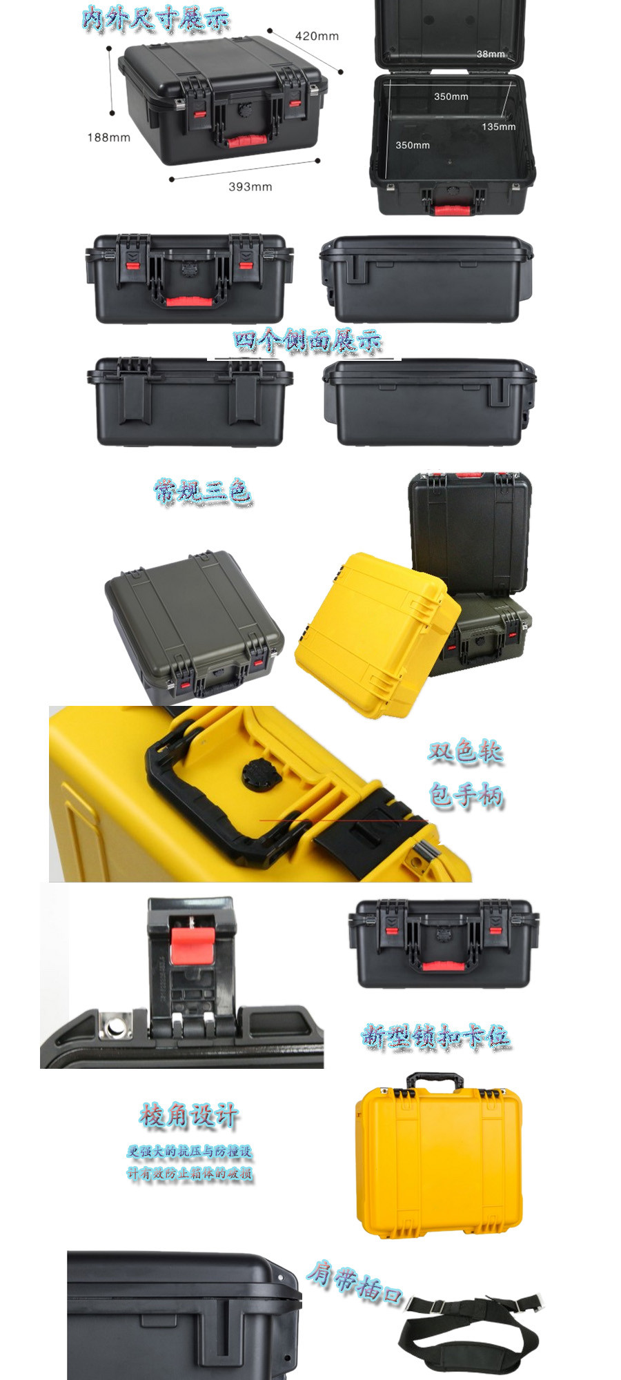 簡(jiǎn)要說(shuō)明:廣泛用于傳媒、公安、消防、軍隊(duì)、航空、戶外攝影、野外考察、科學(xué)探測(cè)等眾多領(lǐng)域的高端儀器、儀表。具有高強(qiáng)度、高抗壓沖擊、防潮、絕對(duì)密封、防塵、防水等特點(diǎn)。產(chǎn)品材質(zhì):ABS原料,箱體采用高抗沖擊的高分子聚合材料一體注塑成型,密封采用扁型彈性發(fā)泡密封橡膠條,確保防水氣密,所有較軸均采用不銹鋼材質(zhì)。