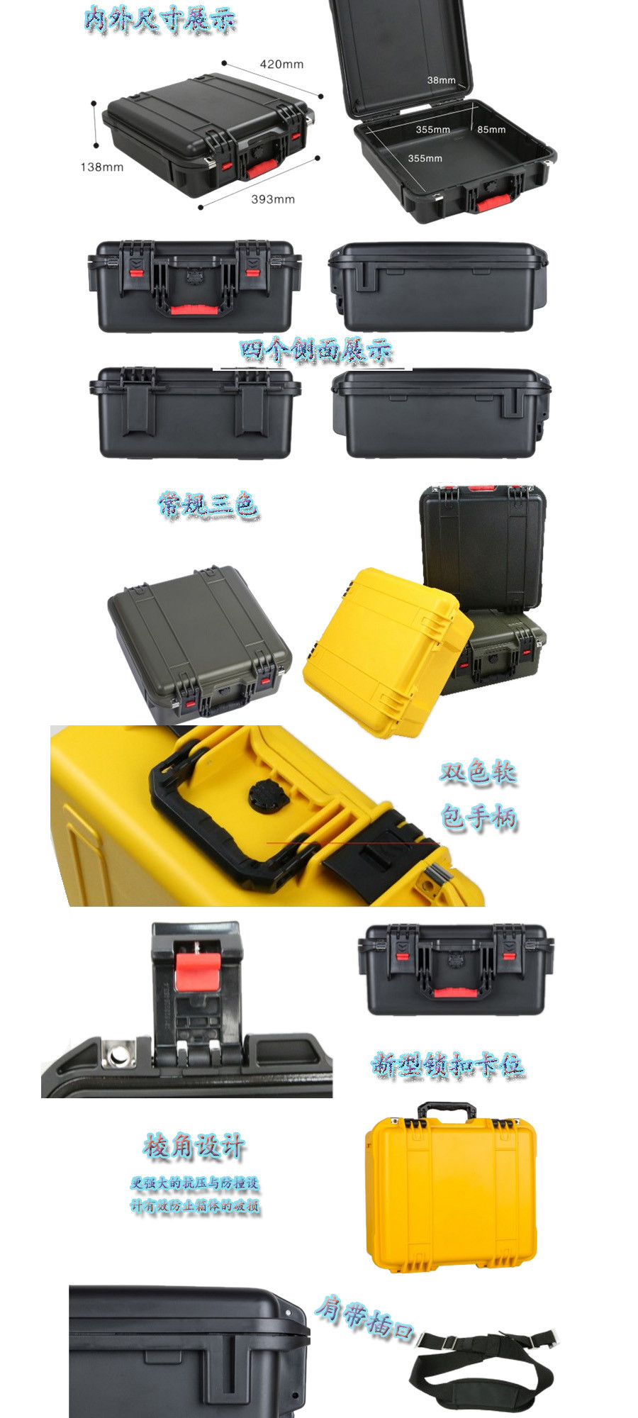 簡要說明:廣泛用于傳媒、公安、消防、軍隊、航空、戶外攝影、野外考察、科學(xué)探測等眾多領(lǐng)域的高端儀器、儀表。具有高強度、高抗壓沖擊、防潮、絕對密封、防塵、防水等特點。產(chǎn)品材質(zhì):ABS原料,箱體采用高抗沖擊的高分子聚合材料一體注塑成型,密封采用扁型彈性發(fā)泡密封橡膠條,確保防水氣密,所有較軸均采用不銹鋼材質(zhì)。