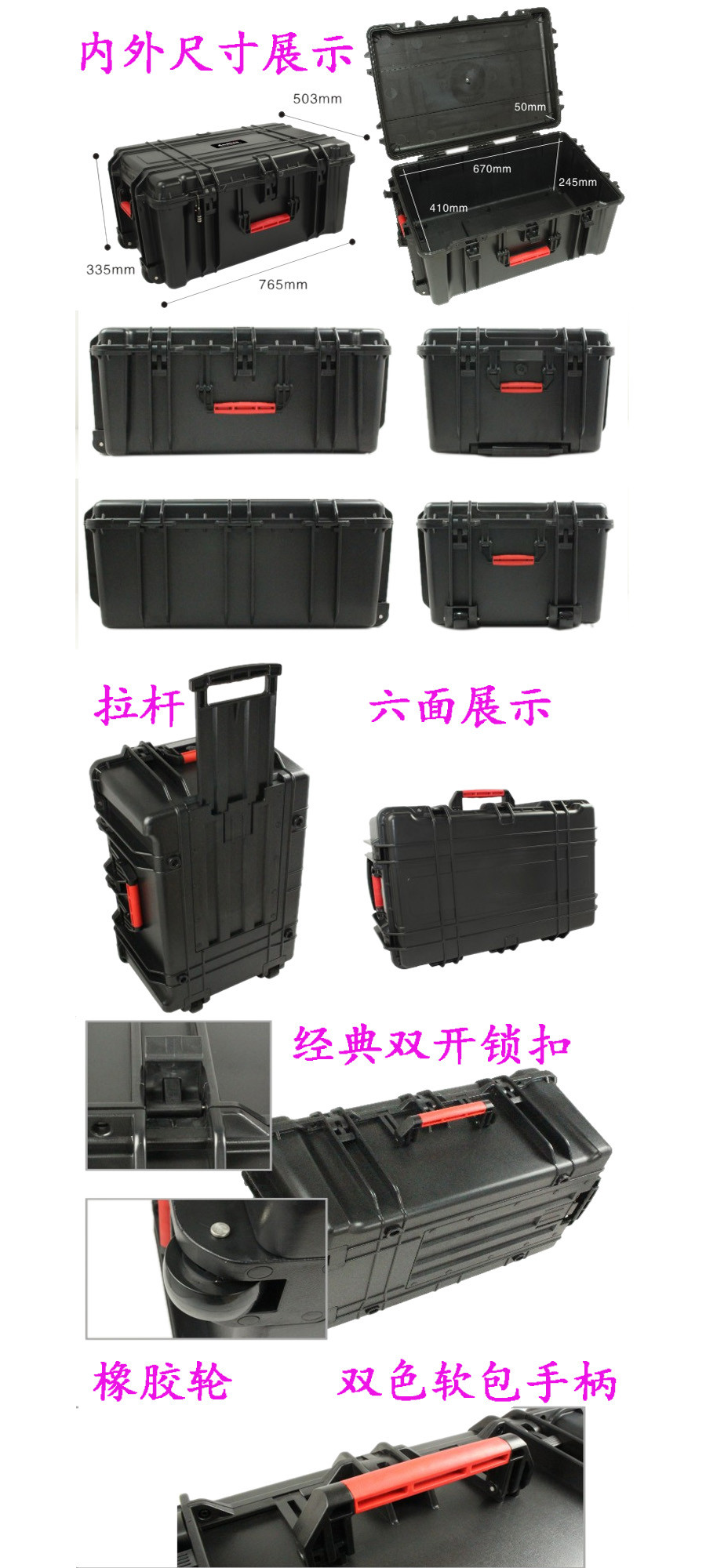 簡要說明:廣泛用于傳媒、公安、消防、軍隊(duì)、航空、戶外攝影、野外考察、科學(xué)探測等眾多領(lǐng)域的高端儀器、儀表。具有高強(qiáng)度、高抗壓沖擊、防潮、絕對密封、防塵、防水等特點(diǎn)。產(chǎn)品材質(zhì):ABS原料,箱體采用高抗沖擊的高分子聚合材料一體注塑成型,密封采用扁型彈性發(fā)泡密封橡膠條,確保防水氣密,所有較軸均采用不銹鋼材質(zhì)。